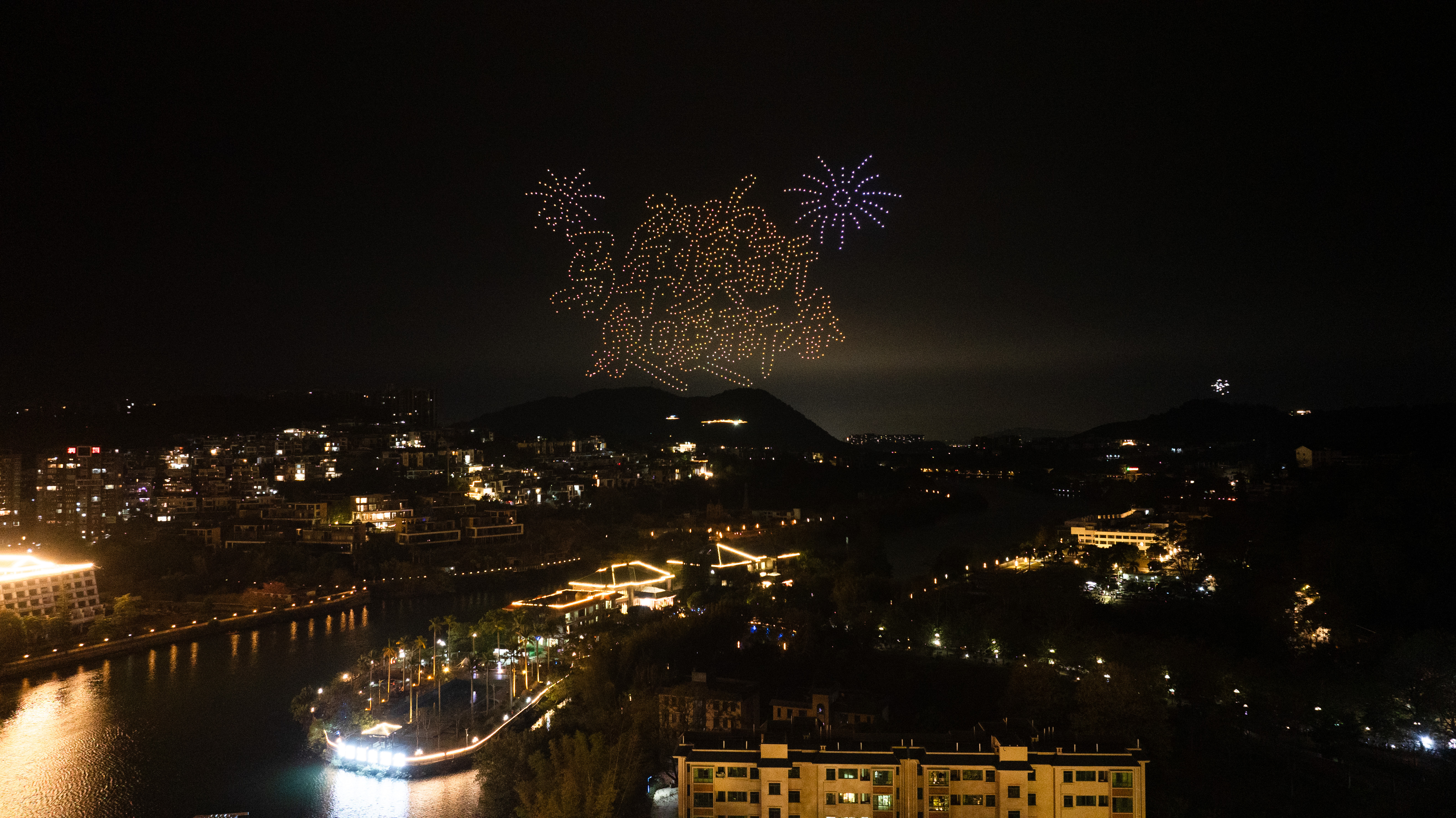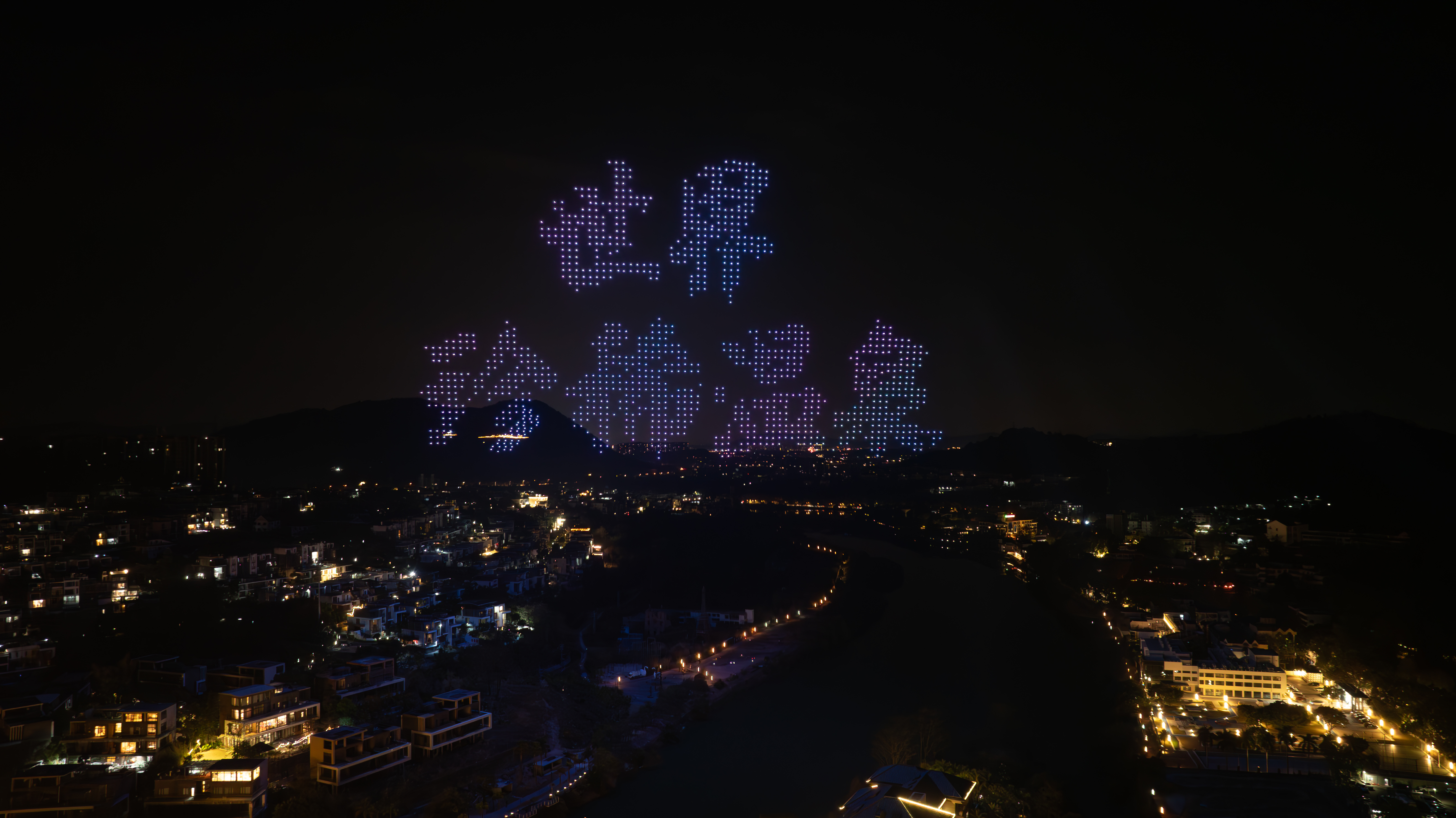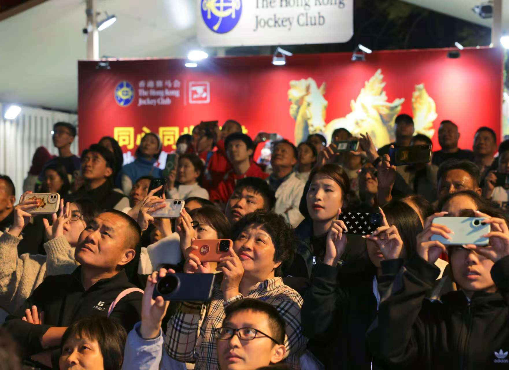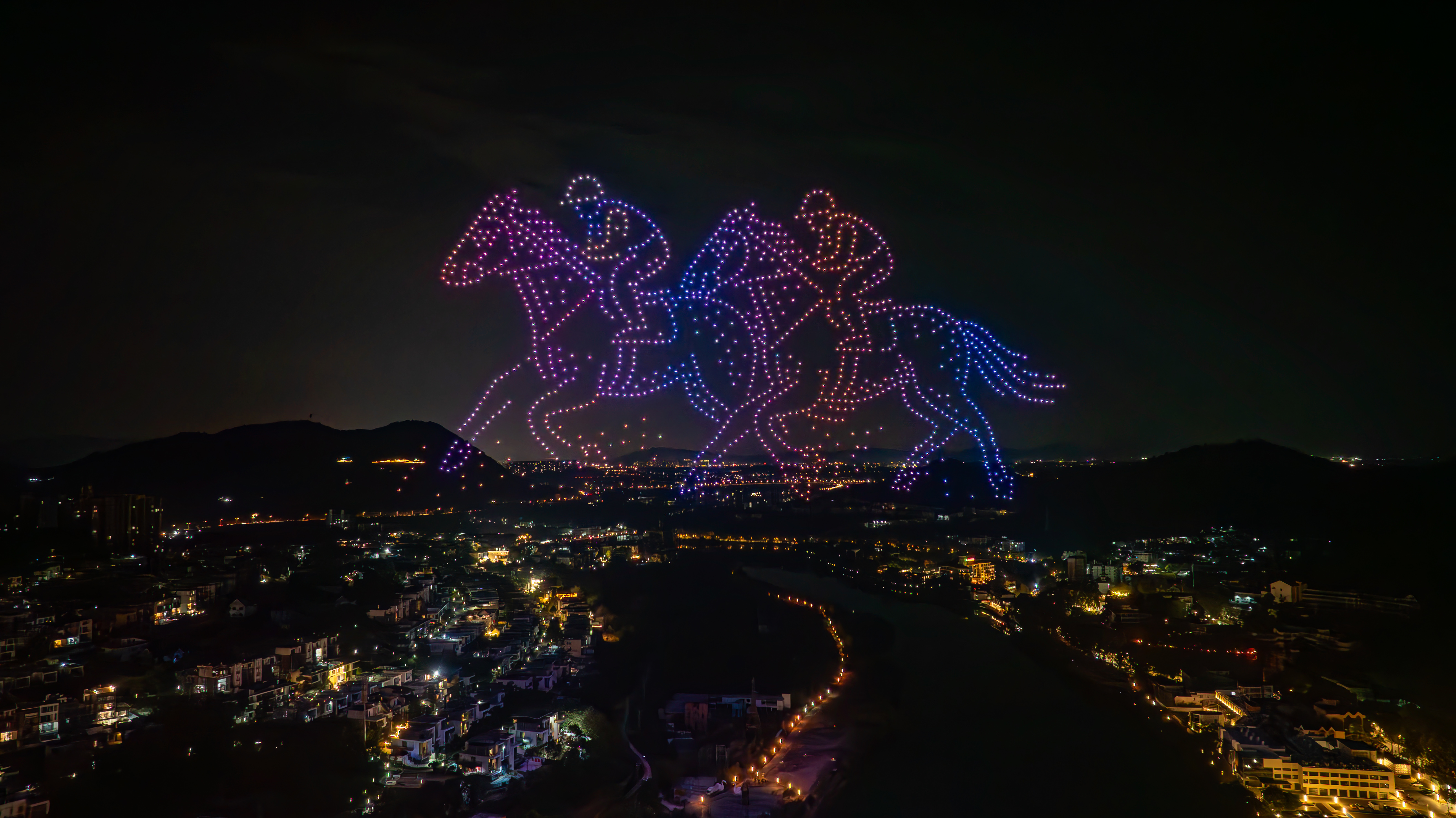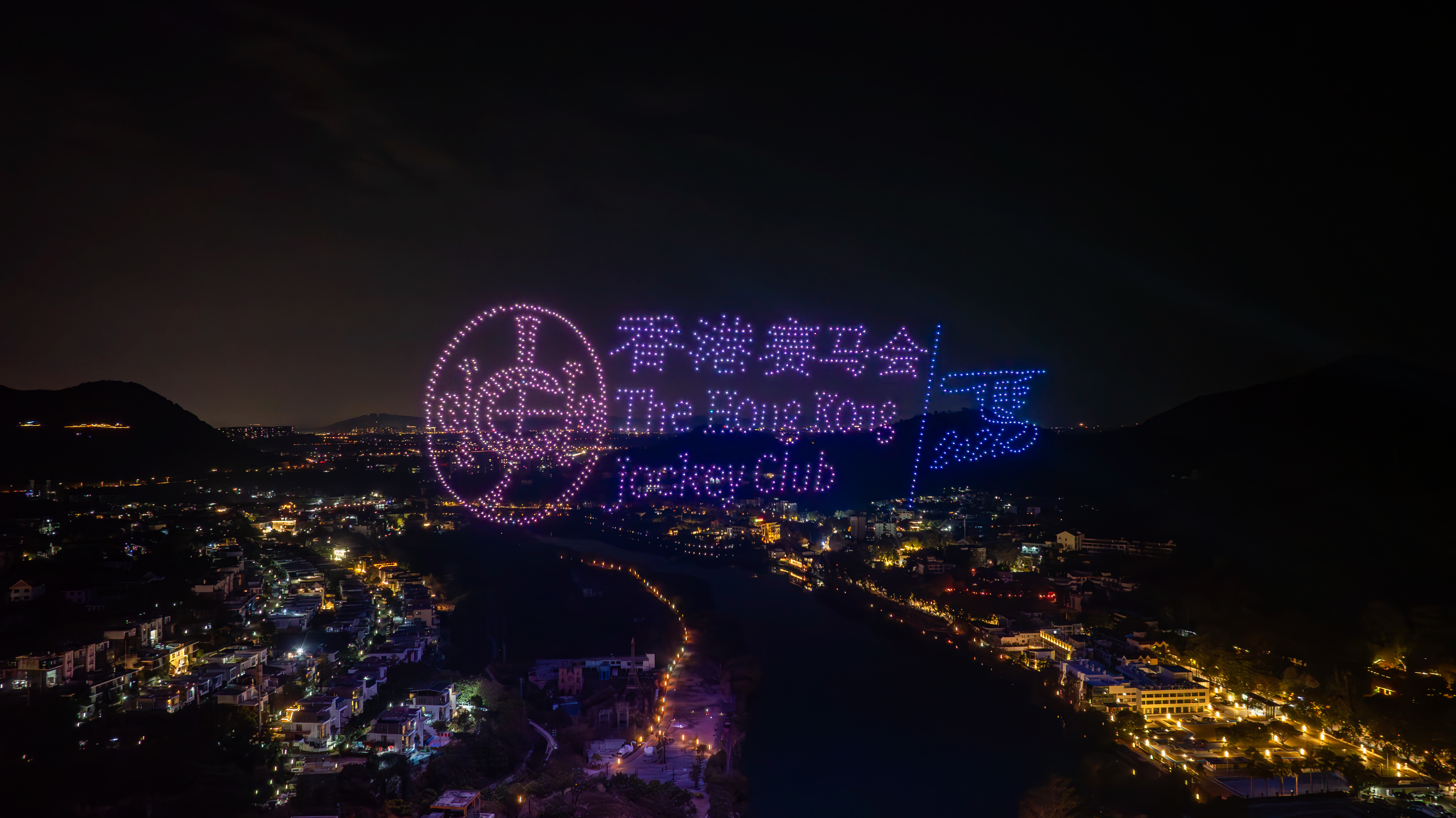 启动仪式后,万众期待的低空光影秀震撼登场。1200架无人机腾空而起,在流溪河上空精准编队,依次变换出香港赛马会标志和吉祥物、“两地三马场”的字样、“马年新春”祥瑞字样以及象征从化生态瑰宝的“世界珍稀温泉”等动态画面。光影流转间,一幅融合湾区活力与岭南风韵的空中画卷徐徐展开,引发现场阵阵惊叹。