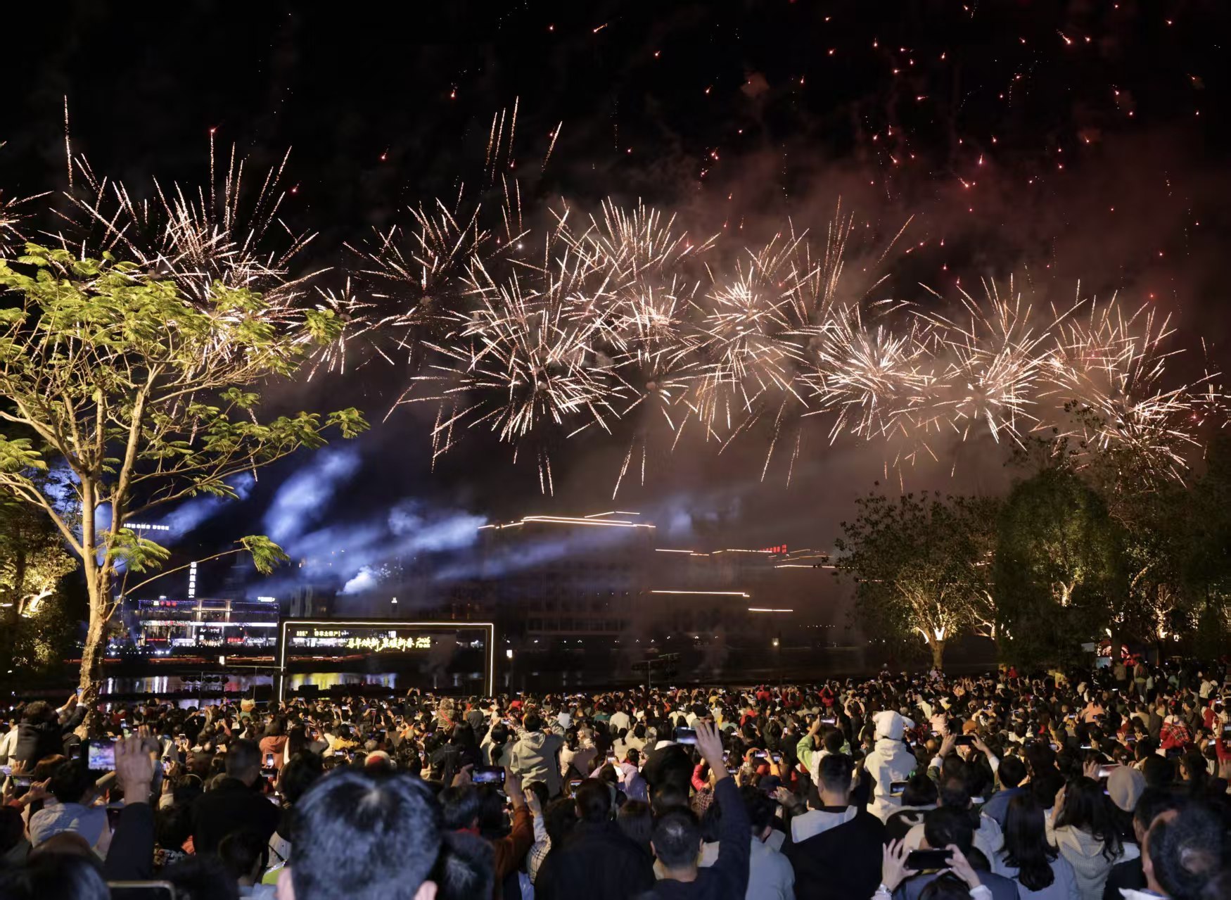 璀璨的烟花倒映在流溪河中,构成一幅绝美的岭南新春画卷。作为粤港澳大湾区生态核心区,从化的绿水青山成为这场光影盛宴的天然幕布,让新春的喜庆氛围与生态之美相得益彰。