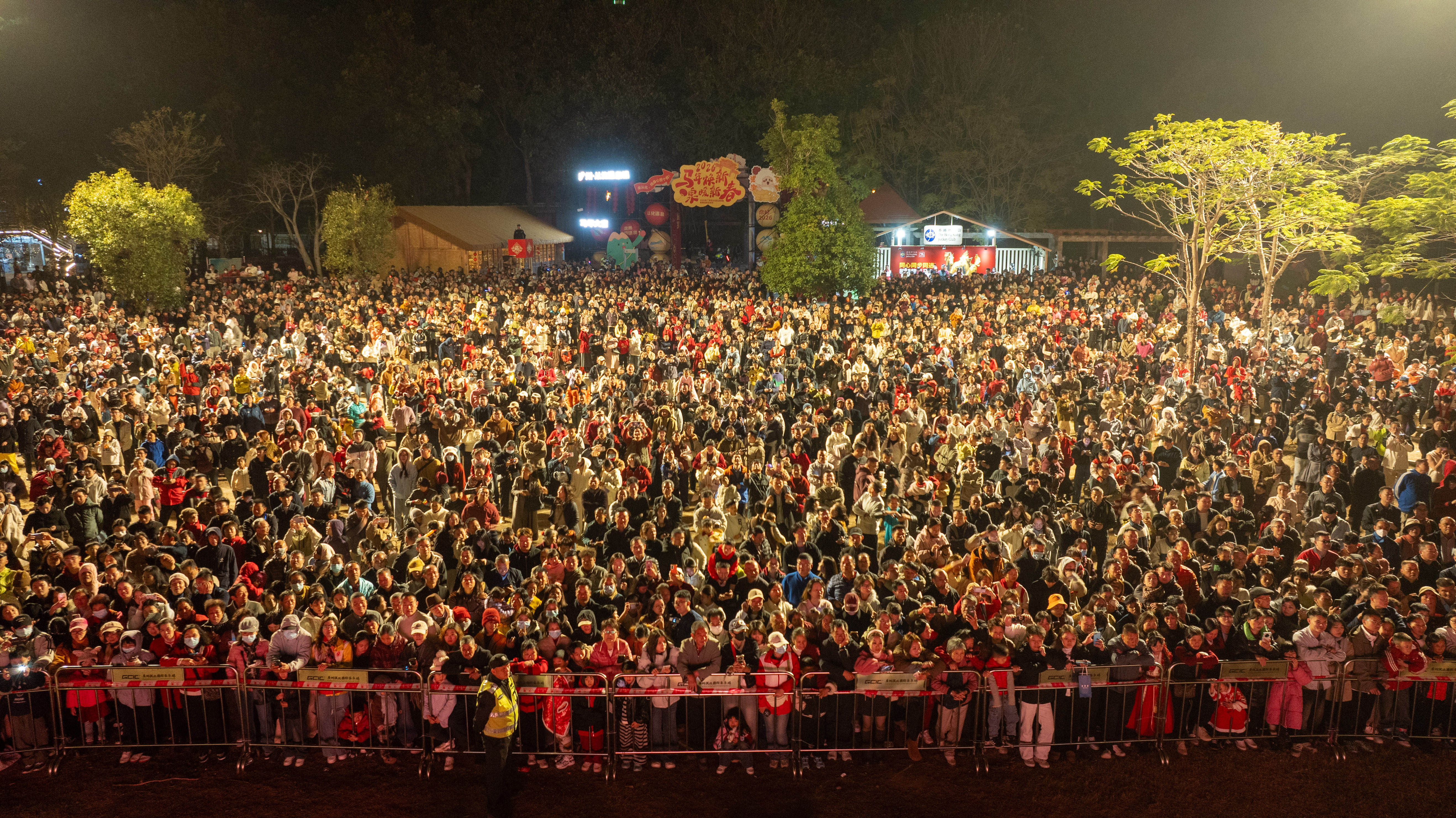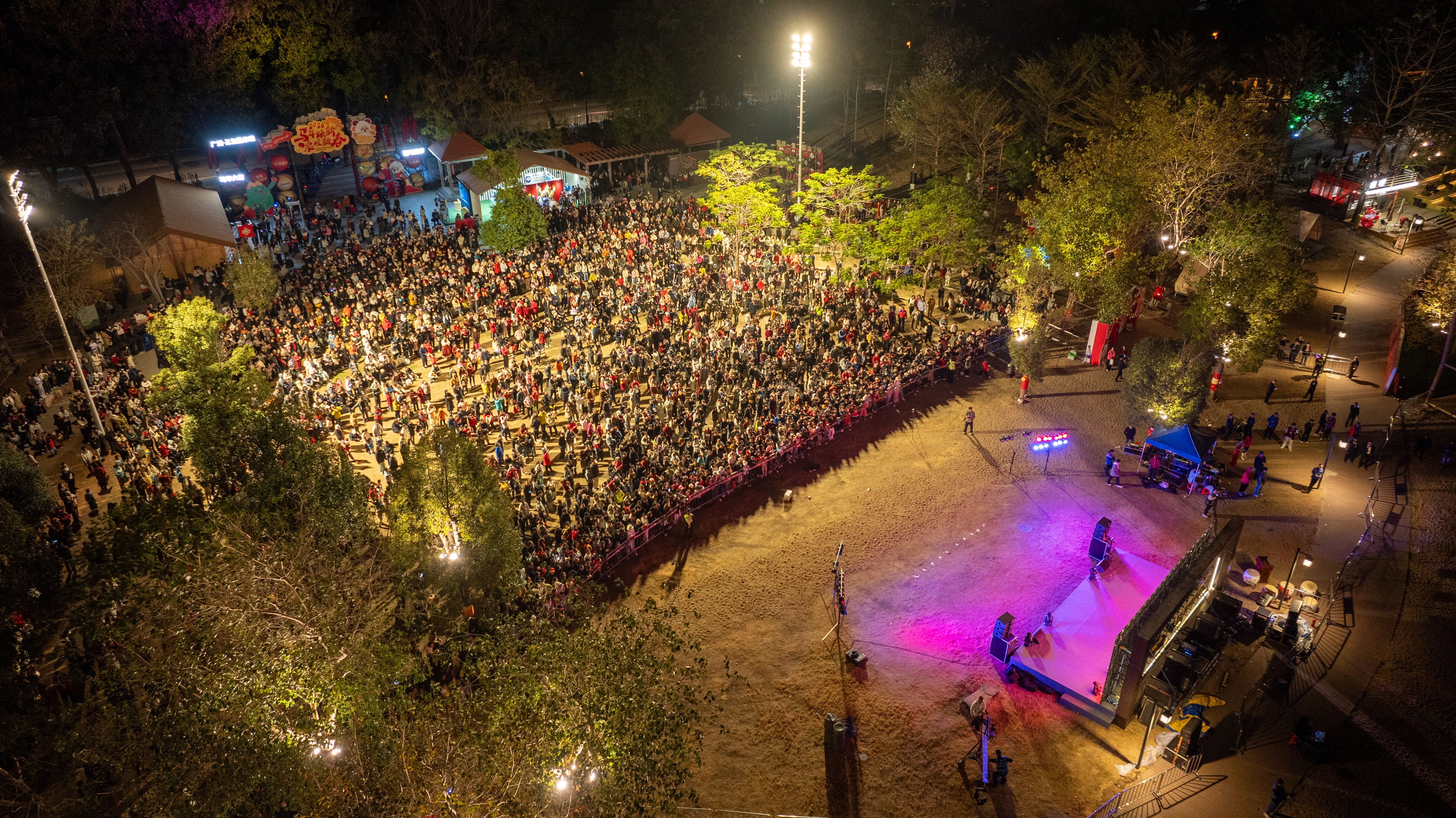 活动现场年味浓郁,互动环节精彩纷呈。乐队倾情献唱,香港赛马会还在现场设置展览和互动游戏区,观众热情参与,流溪河两岸洋溢着欢乐祥和的节日气息。